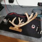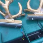 The reindeer horns were rebuilt with layers of fiberglass, sanded, repainted and have new LED lights on the sleigh.