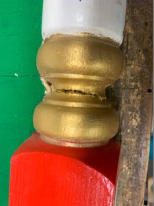 Once I got the chair home, I removed the back of the chair making this one a two piece chair and easier to transport. As I modified the one piece chair to make it a two piece, I noticed a crack in the wooden column on my left side. We drilled a 1/2 hole and inserted a steel rod for strength. Next came the wood putty and sanding.