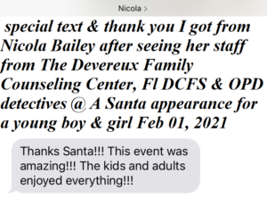 Feb 01, 2021 @ 7:00 pm, Santa pulled up to the The Devereux Family Counseling Center on Westgate dr in Orlando to meet the boy & girl as well as their special team of guardian angels, elves and honorary Santas who looked to give back and help these two heal.