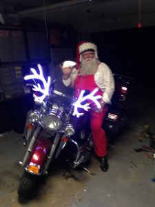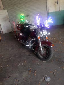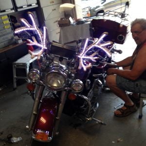 In May we hooked up the quick disconnects for the reindeer horns that were created with a 3-D printer, then came the wiring for the candy canes on the back and Christmas tree mounted to the luggage rack of the tour pack.