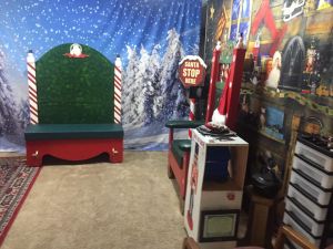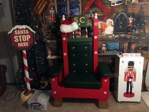 I have a fold up love seat style Santa chair that has done well for families and in many cases the high and wide back may allow us to bypass the use of a backdrop. The snowy covered Christmas tree backdrop is 12 ft across and 8 ft tall. It is a microfiber Kate Backdrop that has gone over very well in the bigger shoots I may appear in.