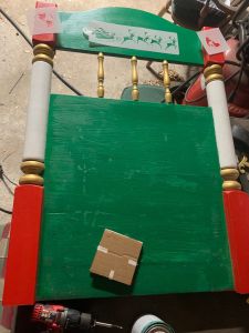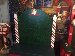 The top end globe pieces were modified to add snowflakes and a snowman on each side. The top center piece or crest was changed to a custom painted Santa and his reindeer vs the wooden crest that is usually used in Santa chairs.