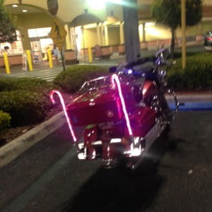 It did not take long for me to want to improve this. Time for LED lights on the reindeer antlers, rear candy canes and now I needed to find a way to mount a Christmas tree to the top of the tour pack. The lights will flash, fade or just glow to an adjustable brightness. with my remote control